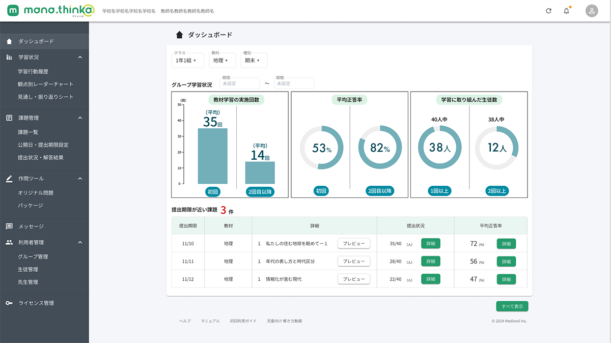生徒の理解度や学習過程の“見える化”ができ、 授業内容や指導方法の見直しにもつながる先生用管理機能が本サービスの特長です。