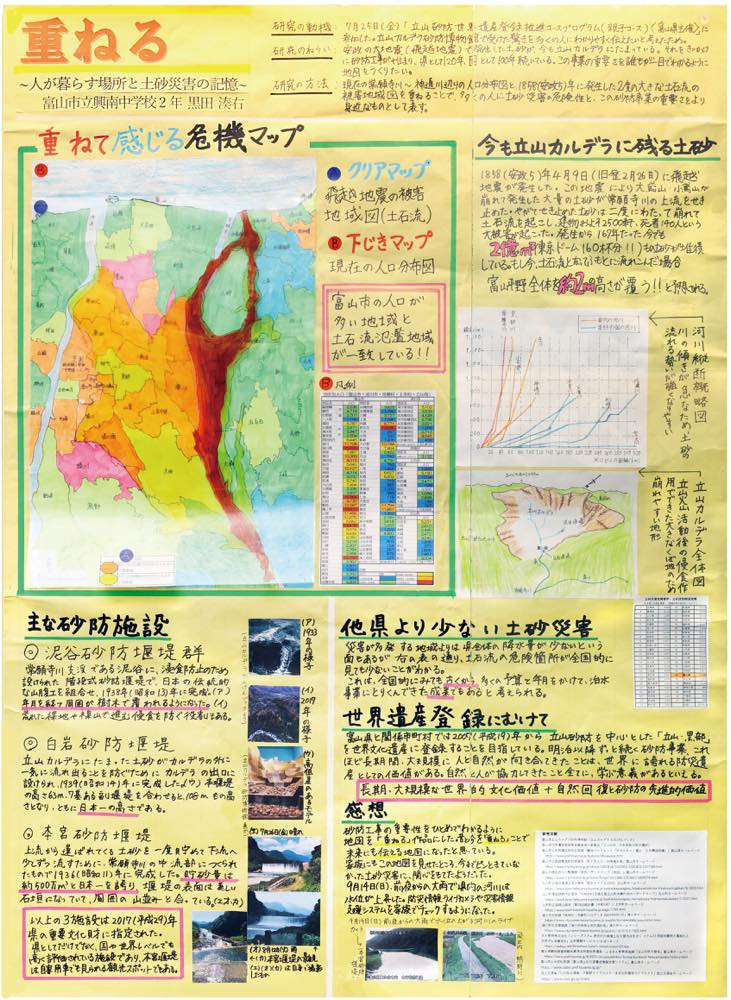 講評:この地図では、まず、富山県の神通川・常願寺川沿いにある富山市や滑川市などの各人口を階級区分図で示しました。その上に、1858年に起きた安政の大地震(飛越地震)の際に常願寺川沿いで大量の土石流の流れた範囲が示された透明なシートを重ねました。県や国の対策により土石流はその後起きていませんが、万が一土石流が再度発生した場合、人口の多い地区で被害にあう危険性の高いことが地図からよくわかります。2枚の地図を重ねた効果がよく表れています。