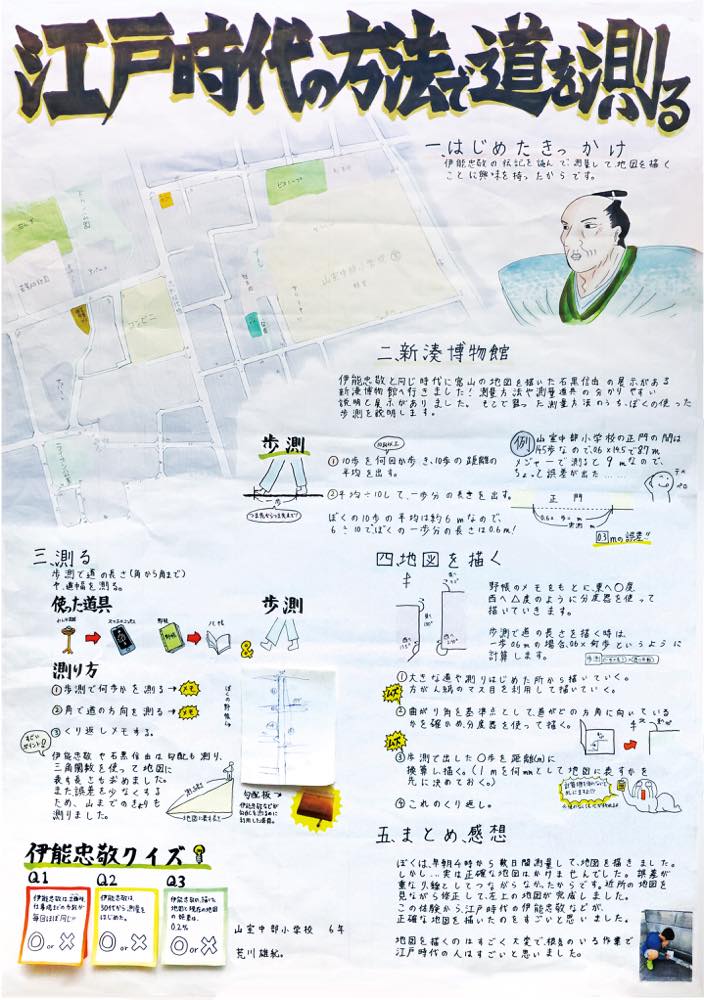 講評:自分の体で歴史と地理を学んだ成果をまとめた地図です。富山県富山市の自宅付近の道路で、何日もかけて歩測という方法を使って距離を測り、算数の勉強を応用して分度器で角度を測って地図づくりに取り組んだ経過をまとめた作品です。誤差が出てしまったとはいえ、試行錯誤しながら地図づくりにチャレンジしたのは素晴らしい取り組みです。作品から、江戸時代に測量と地図づくりを成し遂げた伊能忠敬への深い敬意が伝わります。