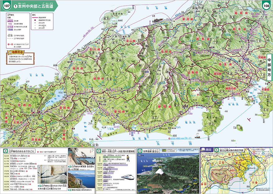 江戸時代の五街道や航路を示した地図や、日本をユーラシア大陸から見わたした地図で、地図帳を歴史的分野でも活用できます。