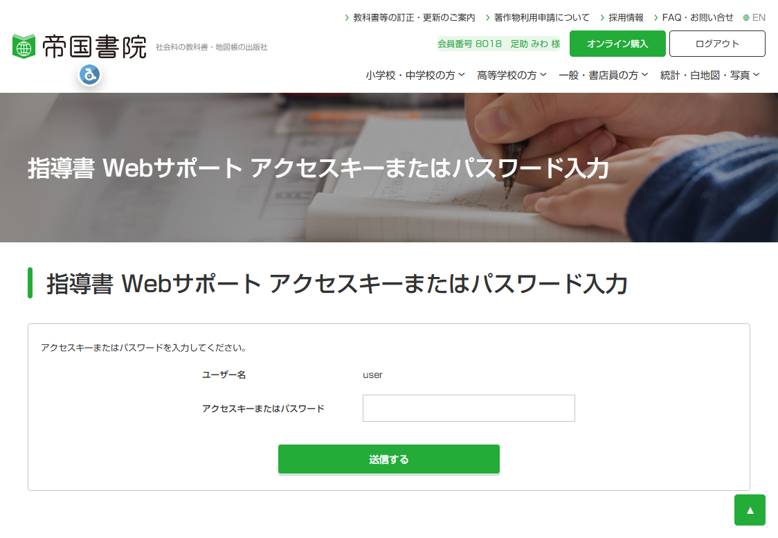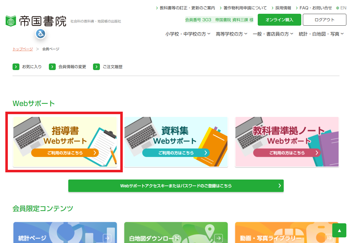 会員ログインすると、会員ページが表示されます。「指導書Webサポート ご利用の方はこちら」というバナーをクリックしてください。
