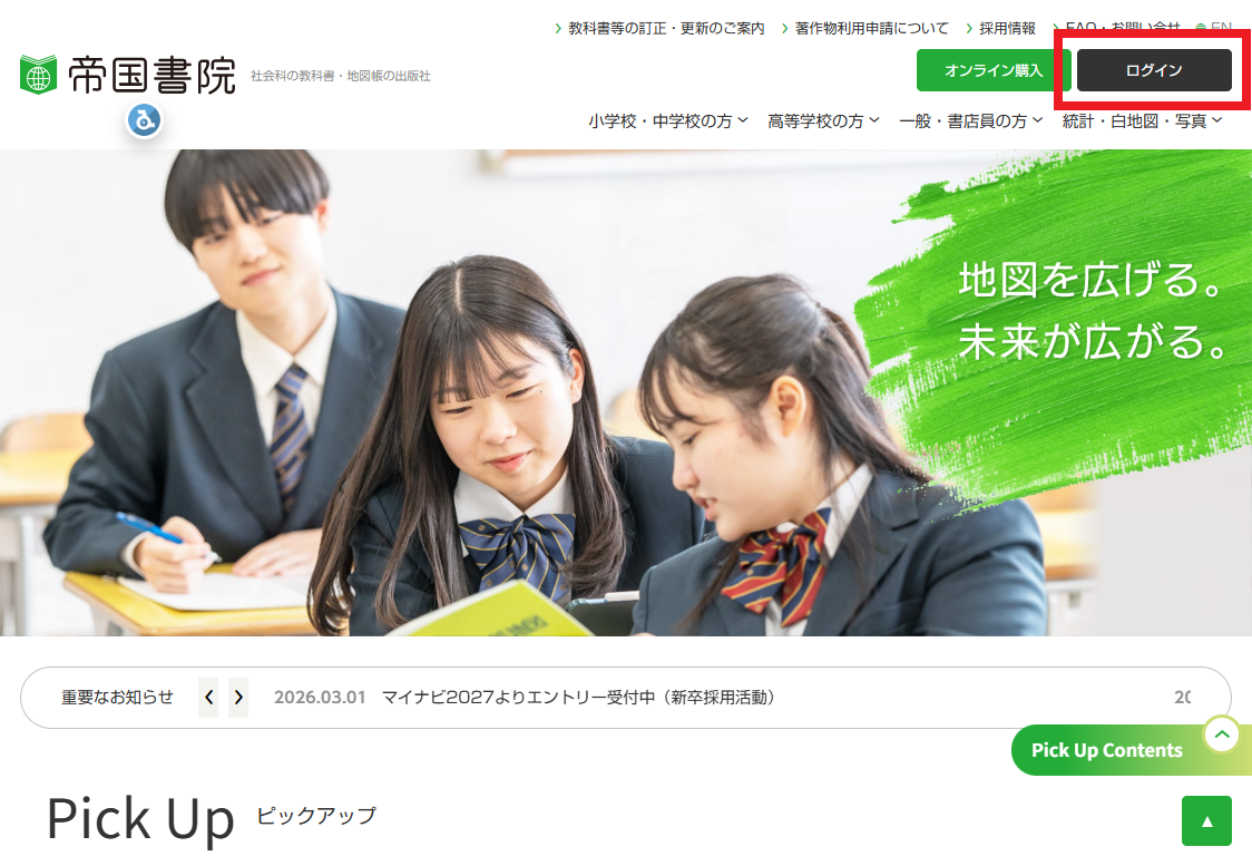 トップページ右上の「ログイン」より会員ログインをしてください。2022年3月より、指導書Webサポートのご利用にあたっては、会員登録を必須とさせていただいております。会員登録の詳しい方法につきましては、こちらをご覧ください。