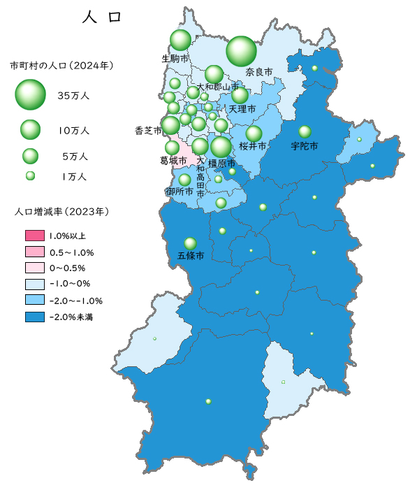 ふりがな 統計 ( とうけい ) でみる 都道府県 ( とどうふけん ) のすがた 奈良県 北海道 青森県 岩手県 宮城県 秋田県 山形県 福島県 茨城県 栃木県 群馬県 埼玉県 千葉県 東京都 神奈川県 新潟県 富山県 石川県 福井県 山梨県 長野県 岐阜県 静岡県 愛知県 三重県 滋賀県 京都府 大阪府 兵庫県 奈良県 和歌山県 鳥取県 島根県 岡山県 広島県 山口県 徳島県 香川県 愛媛県 高知県 福岡県 佐賀県 長崎県 熊本県 大分県 宮崎県 鹿児島県 沖縄県 お気(き)に入(い)りに追加 地図資料 ( ちずしりょう ) をみてみよう! 市区町村 ( しくちょうそん ) 地形 ( ちけい ) 1 地形 ( ちけい ) 2 人口 ( じんこう ) 農業 ( のうぎょう ) 工業 ( こうぎょう ) 観光 ( かんこう ) ・まつり・ 伝統工芸 ( でんとうこうげい ) 白地図 ( はくちず ) 都道府県とどうふけんプロフィール 県名の由来 朝鮮語で「都」を意味する「ナラ」に由来する等の説がある 県章の由来 「ナラ」の「ナ」の文字を図案化したもの 県庁所在地 奈良 県の花 ナラヤエザクラ 県の木 スギ 県の鳥 コマドリ 都道府県 ( とどうふけん ) のデータ 面積 ( めんせき ) (2024年) 3,691 km² ( へいほうキロメートル ) 人口 ( じんこう ) (2024年) 131 万人 ( まんにん ) 人口密度 ( じんこうみつど ) (2024年) 356 人/km² ( にんへいほうキロメートル ) 農業産出額 ( のうぎょうさんしゅつがく ) (2023年) 413 億円 ( おくえん ) 米 ( こめ ) の 収穫量 ( しゅうかくりょう ) (2023年) 42.7 千t ( せんトン ) 野菜 ( やさい ) の 産出額 ( さんしゅつがく ) (2023年) 113 億円 ( おくえん ) 果実 ( かじつ ) の 産出額 ( さんしゅつがく ) (2023年) 83 億円 ( おくえん ) 畜産 ( ちくさん ) の 産出額 ( さんしゅつがく ) (2023年) 65 億円 ( おくえん ) 漁獲量 ( ぎょかくりょう ) (2023年) 0.01 千t ( せんトン ) 工業生産 ( こうぎょうせいさん ) ( 出荷額 ( しゅっかがく ) ) (2022年) 19,623 億円 ( おくえん ) 小売業 ( こうりぎょう ) 年間販売額 ( ねんかんはんばいがく ) (2020年) 10,995 億円 ( おくえん ) 何 ( なん ) でも 日本一 ( にほんいち ) 靴下(ソックス)の生産 1世帯あたり牛肉購入量 動画 ( どうが ) ・ 写真 ( しゃしん ) ライブラリー 彼岸花(明日香村) 2014年9月 長谷寺(桜井市) 2013年9月 飛鳥寺(明日香村) 2013年9月 斑鳩の里(斑鳩町) 2013年5月 斑鳩の里(斑鳩町) 2013年5月 もっとみる