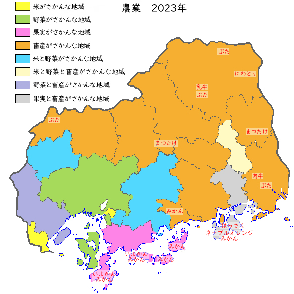 ふりがな 統計 ( とうけい ) でみる 都道府県 ( とどうふけん ) のすがた 広島県 北海道 青森県 岩手県 宮城県 秋田県 山形県 福島県 茨城県 栃木県 群馬県 埼玉県 千葉県 東京都 神奈川県 新潟県 富山県 石川県 福井県 山梨県 長野県 岐阜県 静岡県 愛知県 三重県 滋賀県 京都府 大阪府 兵庫県 奈良県 和歌山県 鳥取県 島根県 岡山県 広島県 山口県 徳島県 香川県 愛媛県 高知県 福岡県 佐賀県 長崎県 熊本県 大分県 宮崎県 鹿児島県 沖縄県 お気(き)に入(い)りに追加 地図資料 ( ちずしりょう ) をみてみよう! 市区町村 ( しくちょうそん ) 地形 ( ちけい ) 1 地形 ( ちけい ) 2 人口 ( じんこう ) 農業 ( のうぎょう ) 工業 ( こうぎょう ) 観光 ( かんこう ) ・まつり・ 伝統工芸 ( でんとうこうげい ) 白地図 ( はくちず ) 都道府県とどうふけんプロフィール 県名の由来 毛利氏が開城した時の太田川の三角州の名前「広島」に由来する 県章の由来 「ヒロシマ」の「ヒ」の文字を図案化したもの 県庁所在地 広島 県の花 モミジ 県の木 モミジ 県の鳥 アビ 都道府県 ( とどうふけん ) のデータ 面積 ( めんせき ) (2024年) 8,479 km² ( へいほうキロメートル ) 人口 ( じんこう ) (2024年) 275 万人 ( まんにん ) 人口密度 ( じんこうみつど ) (2024年) 324 人/km² ( にんへいほうキロメートル ) 農業産出額 ( のうぎょうさんしゅつがく ) (2023年) 1,448 億円 ( おくえん ) 米 ( こめ ) の 収穫量 ( しゅうかくりょう ) (2023年) 112.9 千t ( せんトン ) 野菜 ( やさい ) の 産出額 ( さんしゅつがく ) (2023年) 295 億円 ( おくえん ) 果実 ( かじつ ) の 産出額 ( さんしゅつがく ) (2023年) 167 億円 ( おくえん ) 畜産 ( ちくさん ) の 産出額 ( さんしゅつがく ) (2023年) 691 億円 ( おくえん ) 漁獲量 ( ぎょかくりょう ) (2023年) 111 千t ( せんトン ) 工業生産 ( こうぎょうせいさん ) ( 出荷額 ( しゅっかがく ) ) (2022年) 106,923 億円 ( おくえん ) 小売業 ( こうりぎょう ) 年間販売額 ( ねんかんはんばいがく ) (2020年) 31,329 億円 ( おくえん ) 何 ( なん ) でも 日本一 ( にほんいち ) ネーブルオレンジの生産 かき類の養殖 動画 ( どうが ) ・ 写真 ( しゃしん ) ライブラリー 五重塔(廿日市市) 2011年11月 紅葉谷公園(廿日市市) 2011年11月 瀬戸内海(廿日市市) 2011年11月 瀬戸内海(廿日市市) 2011年11月 弥山(廿日市市) 2011年11月 もっとみる
